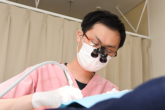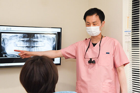 当院では、丁寧なカウンセリングを重視しています。初診時には十分な時間を確保し、患者さんのお口の状態を確認したうえで、お悩みや治療へのご要望をじっくりお伺いします。そのうえで、一人ひとりに合った適切な治療法をご提案し、ご納得いただいてから治療を進めてまいります。安心して治療に臨んでいただけるよう心掛けています。