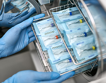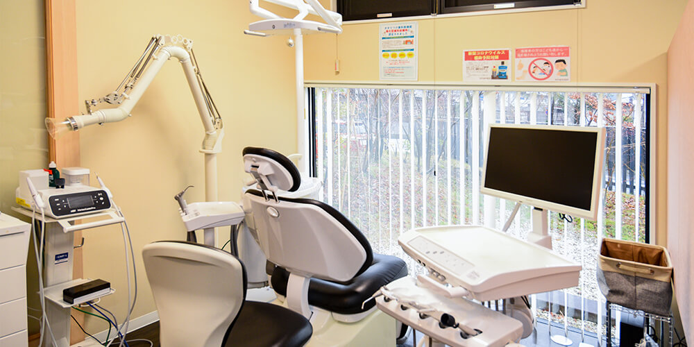 患者さんが安心して治療を受けられるよう、器具は高圧蒸気滅菌器で滅菌後、滅菌パックで保管し、使い捨て製品も使用しています。さらに、治療時に発生する飛沫・粉じんは口腔外バキュームで吸引し、診察室の空気を清潔に保っています。