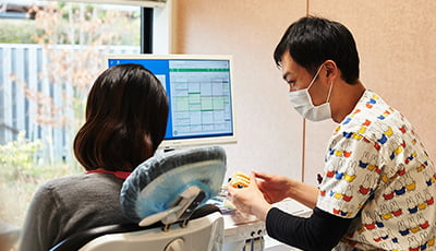当院では、患者様のお口の中の情報をコンピューターで管理しており虫歯や歯周病の検査結果を表やイラストで分かりやすく説明しています。